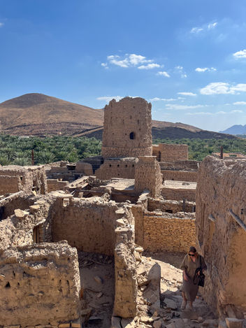 From there, we drove to Birkat Al Mouz, a village of ancient ruins nestled at the foot of the mountains. Wandering through the crumbling mud-brick houses gives you a real sense of traditional Omani life. But be careful—some parts of the ruins are unstable, so watch your step. Just around the corner, we found Heritage Café, a cozy spot for lunch
