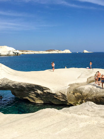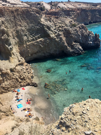 Another fantastic beach worth visiting is Tsigrado — a true hidden treasure on Milos. The water here is stunningly blue, shimmering against the backdrop of rust-colored cliffs that frame the cove like a secret doorway.